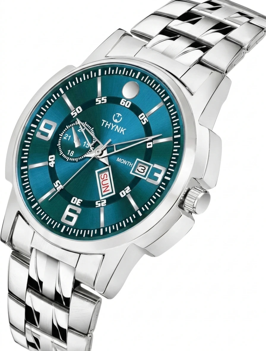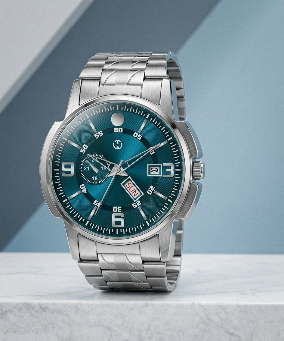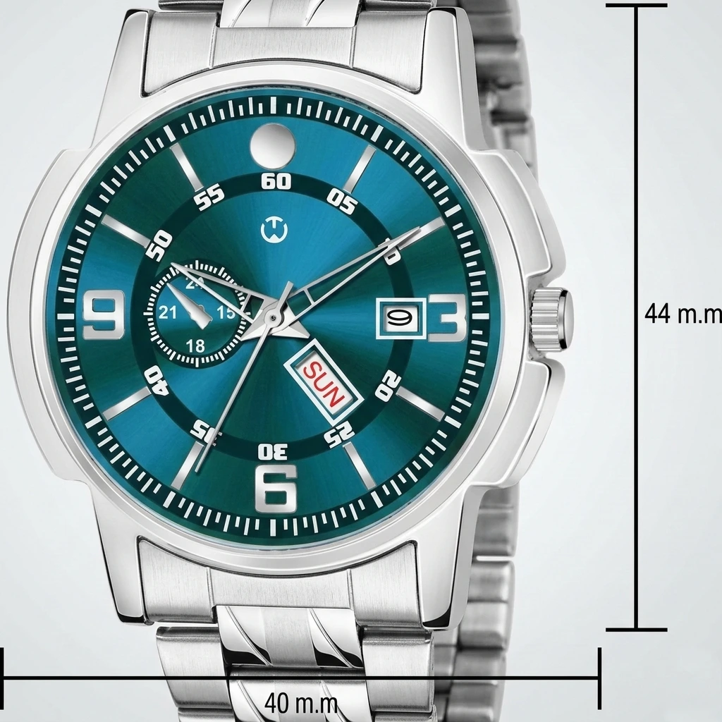 Elevate your daily style with this Premium Silver Stainless Steel Analog Watch. Featuring a striking deep teal sunray dial and a robust industrial-inspired case, this timepiece is designed for the man who appreciates a blend of sporty functionality and contemporary elegance.